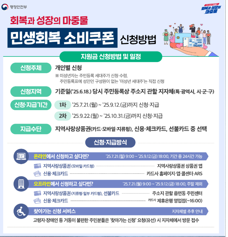 오프라인 신청은 주소지 관할 읍·면·동 주민센터에서 가능하며, 신분증과 신청서만 지참하시면 됩니다.