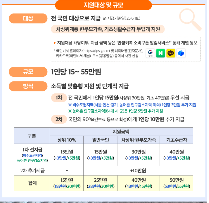 지급 금액은 기본 1인당 25만원, 기초생활수급자 및 차상위계층은 추가 10만원으로 최대 55만원까지 받을 수 있습니다.