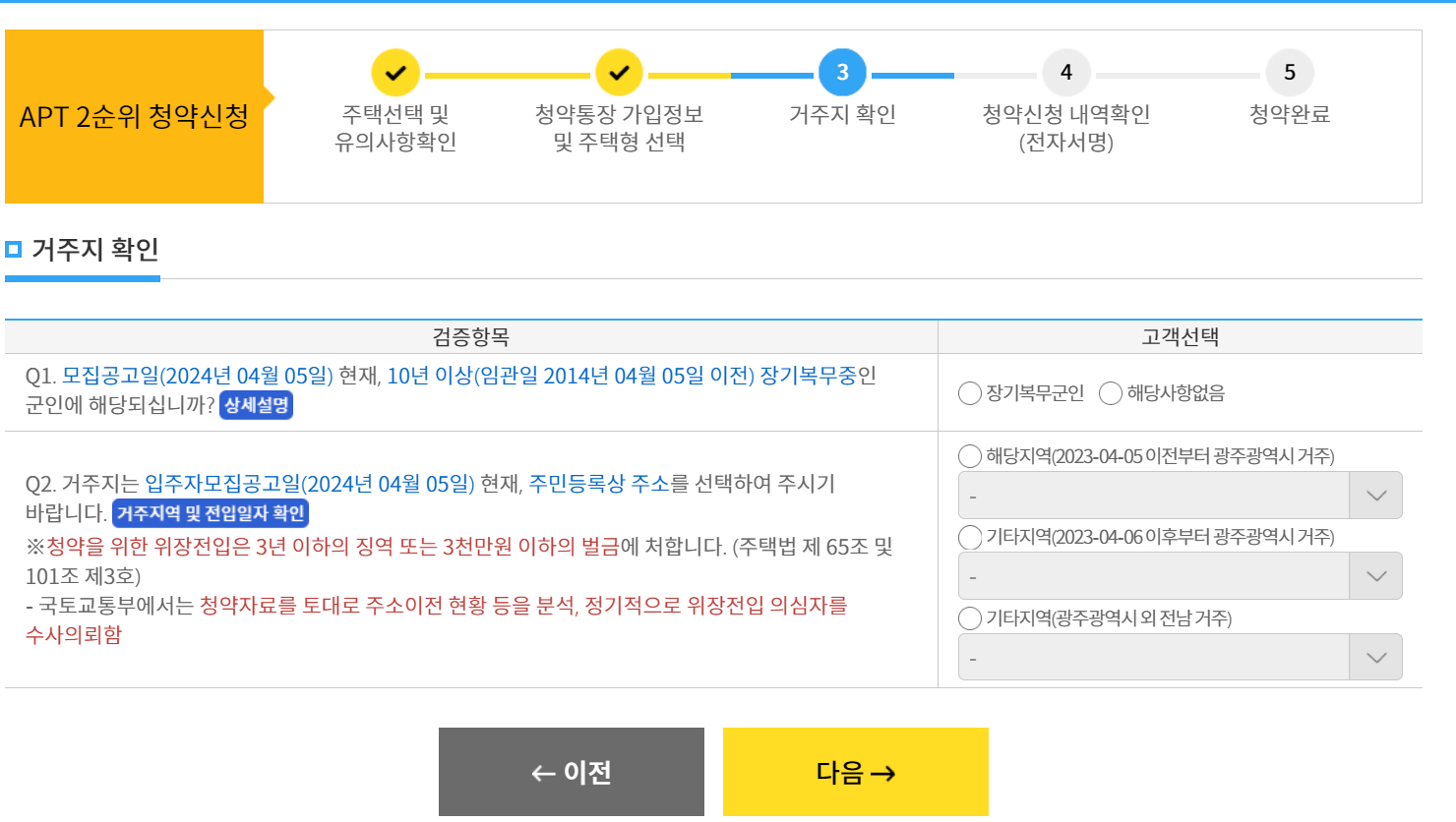 신청서에 거주지 확인, 청약통장 가입내역, 주택 소유 확인, 과거 2년 이내 당첨 여부 등 을 체크합니다. 본인 입력 오류로 인해 당첨 취소가 되면 1년간 신청 불가합니다.