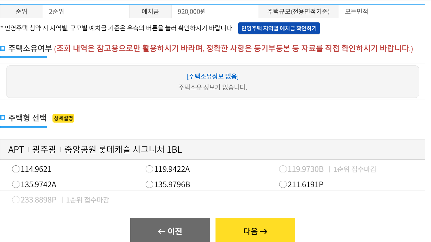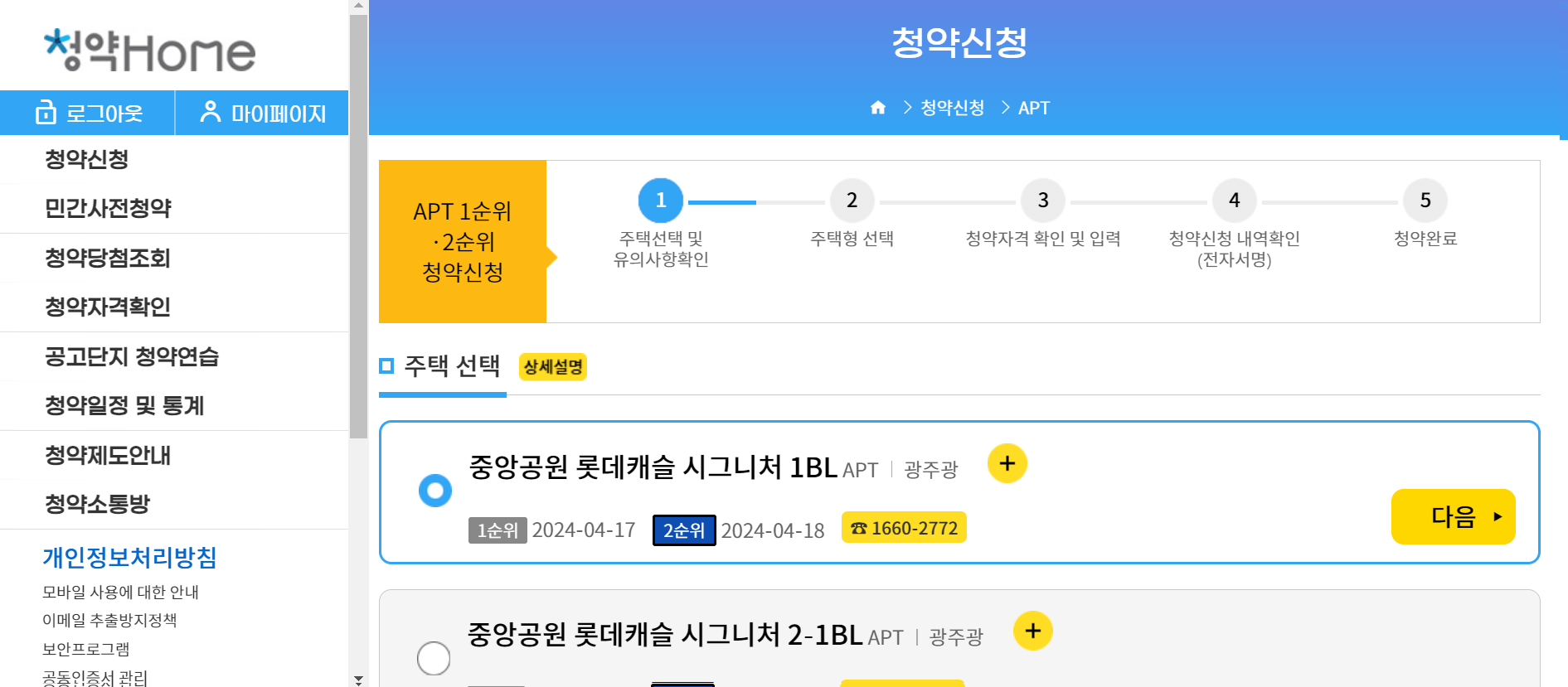 로그인하고 청약 신청을 클릭하면 다음과 같이 청약 종류가 나옵니다.