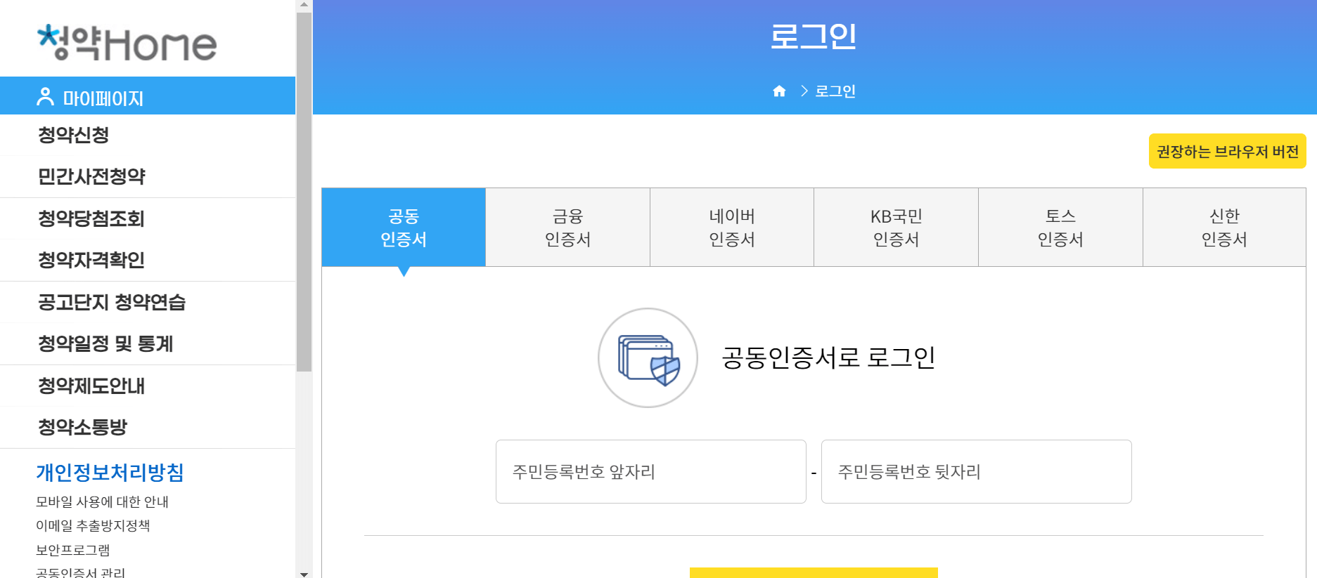 한국 감정원 청약홈에 접속하면 회원 가입 및 로그인을 합니다. 로그인 방법은 위와 같이 여러개가 있지만 공동 인증서 또는 금융 인증서를 이용하세요. 청약 종류에 따라 나머지(네이버, KB국민, 토스, 신한) 로그인할 경우 청약 신청 불가한 경우도 있습니다.