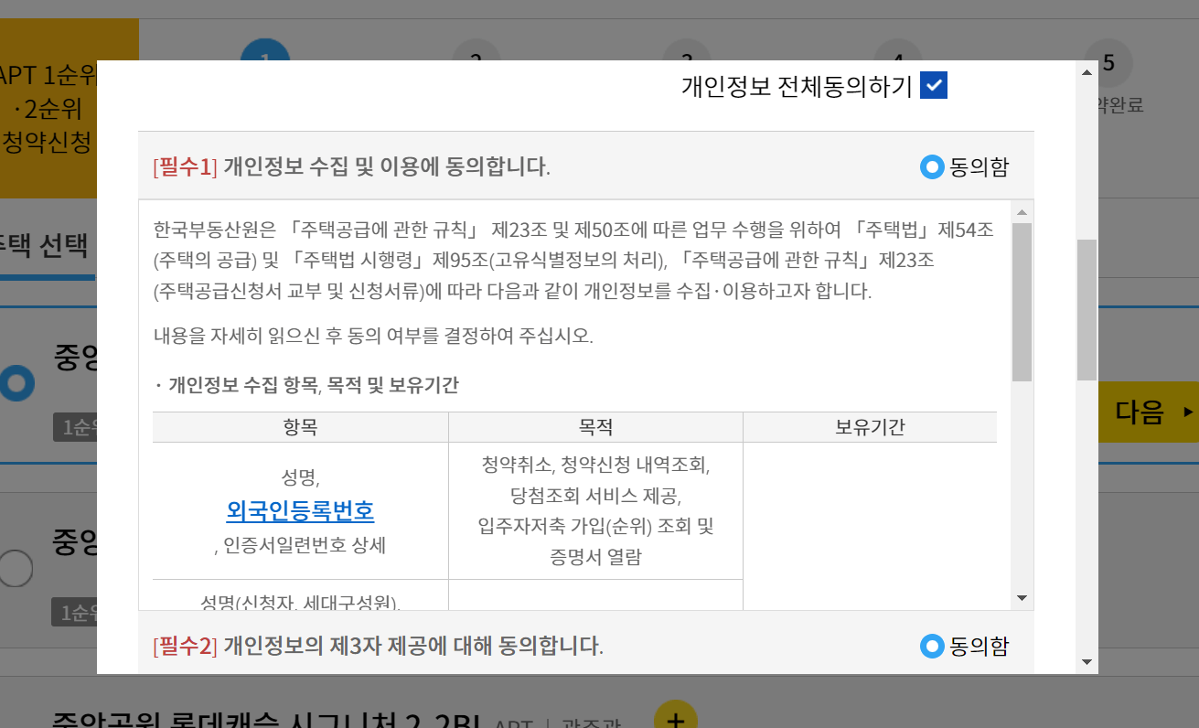 유의사항 확인함을 클릭하고 개인정보 전체동의하기 클릭합니다. 모두 필수로 체크해야 하는 사항입니다.