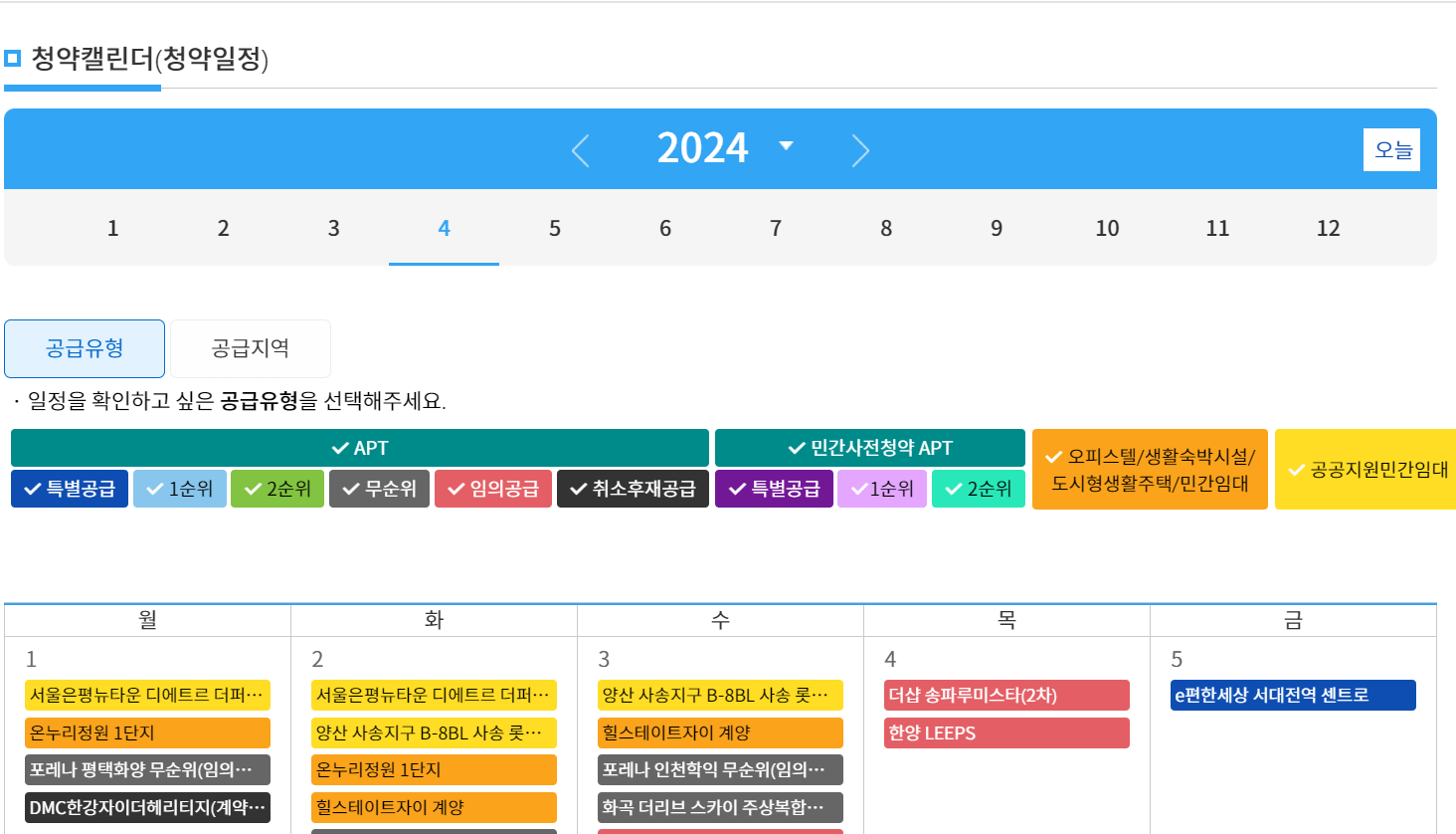 청약 홈화면에서 청약 캘린더를 클릭할 경우 날짜별로 청약 신청 가능한 주택을 볼 수 있습니다.