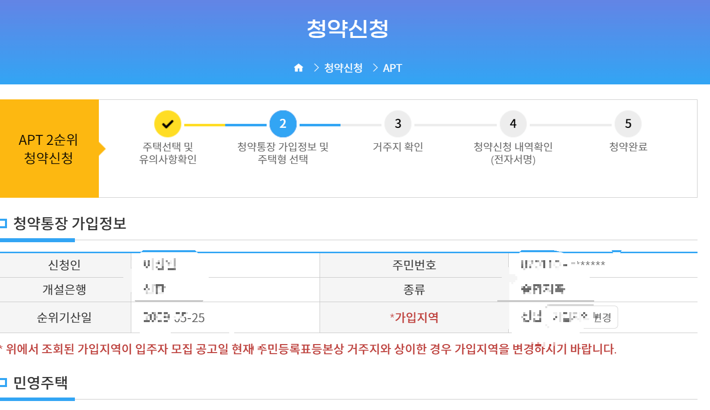 로그인한 정보를 바탕으로 자동으로 청약통장 가입정보가 입력됩니다. 조회된 가입지역이 입주자 모집 고공일 현재 ㅈ민등록표등본상 거주지와 다를 경우 가입지역을 변경해야 합니다.