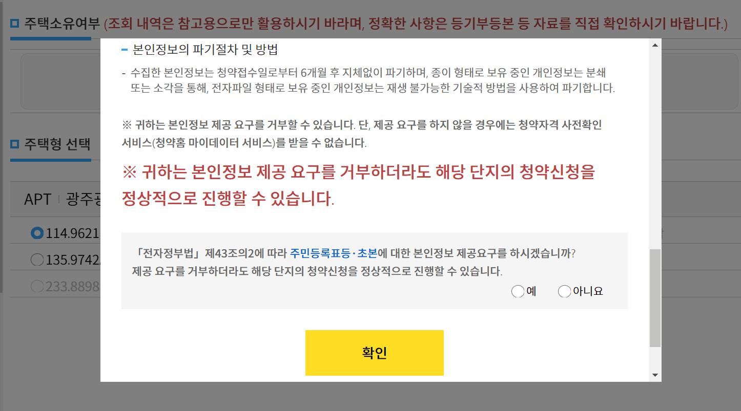다음과 같은 안내문에 예를 체크하고 확인을 누릅니다. 아니요를 눌러도 청약 신청은 할 수 있지만 청약 자격 사전확인 서비스를 받을 수 없습니다.
