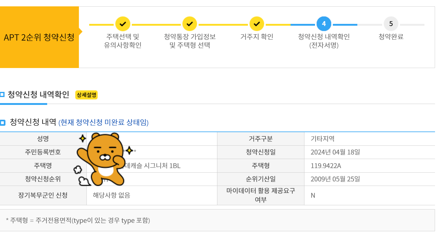 청약 신청을 완료하면 마이페이지에서 신청 내역을 확인하시기 바랍니다. 당첨자는 당첨자 발표일에 입력한 번호로 연락이 갑니다.