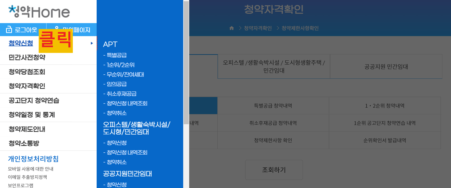 신청하고자 하는 청약 종류를 선택하고 청약 신청하기를 클릭합니다.